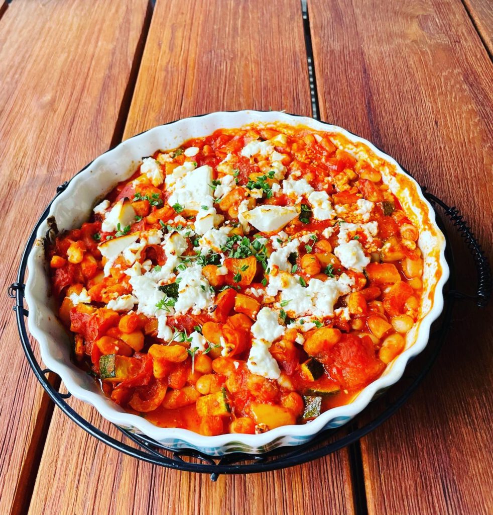 Den Backofen auf 200 Grad vorheizen. Zwiebeln, Knoblauch und Zucchini in einer feuerfesten Pfanne mit dem Öl anschwitzen. Danach die gehackten Tomaten und weißen Bohnen zugeben. Jetzt die Gewürze zugeben und verrühren. Den Fetakäse zerbröseln und über die Masse verteilen. Die Pfanne dann für ca. 20 Minuten in den Backofen stellen und backen bis der Fetakäse sich leicht bräunlich färbt.